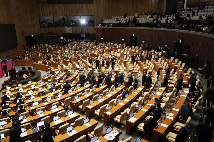 | 8일 오후 국회 본회의에서 내란 특검법, 김건희 여사 특검법, 양곡관리법 개정안 등 농업 관련 법안 4개, 국회법 개정안, 국회증언감정법 개정안이 재표결 끝에 부결되자 야당 의원들이 밖으로 나서고 있다. /연합뉴스 |
